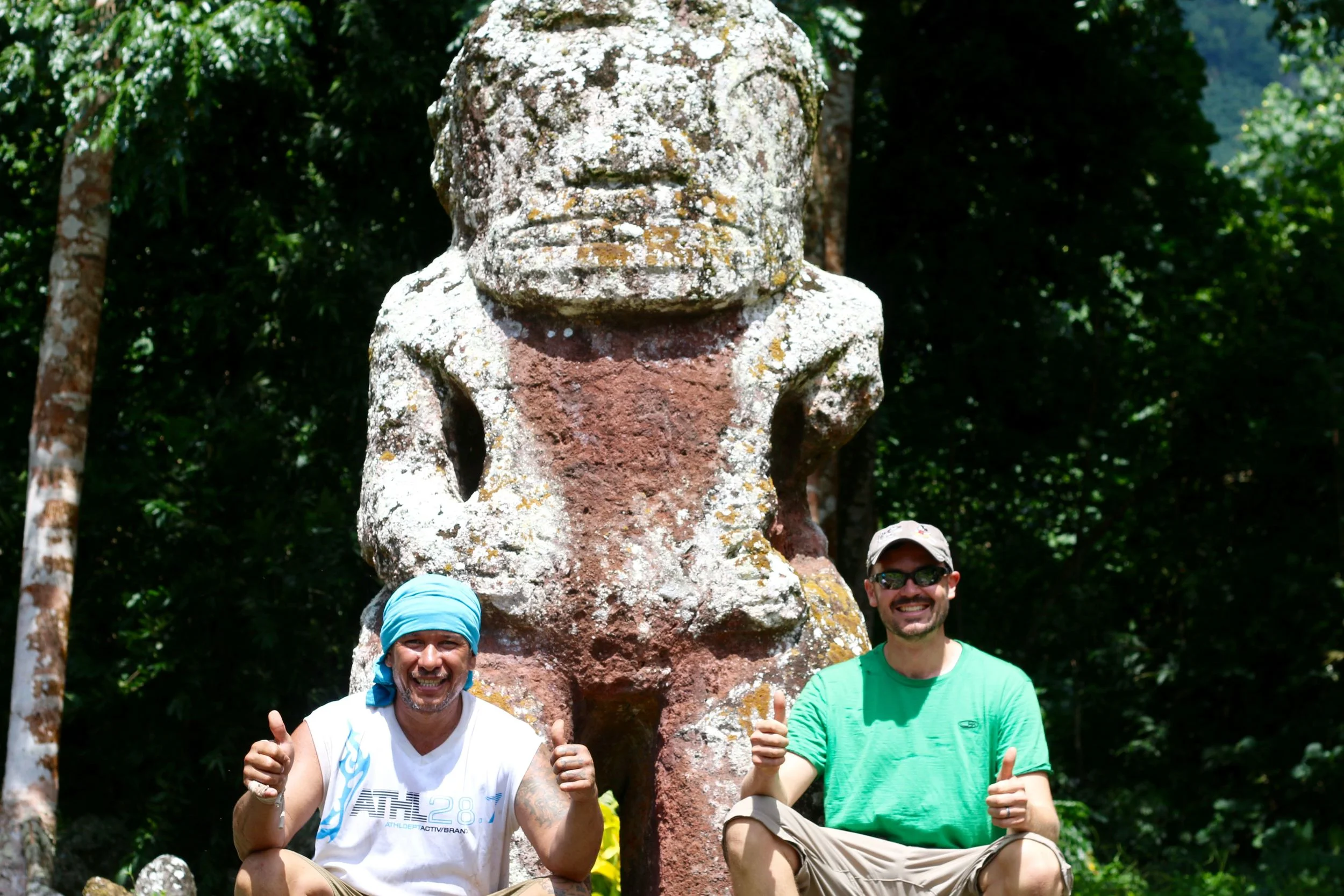 Mario takes us around to the back of his yard to show us his own Tiki. Tiki are stone carvings of spirits or gods. Mario explains that his Grandfather owned this land, then his father, and now him. The Tiki lives with the land, and so now this is Mario's Tiki to care for. The Tiki rests cheerfully beneath a tropical tree, looking back at Mario. I ask if I can photograph the Tiki, and Mario smiles a huge smile. Mario enthusiastically jumps beside his Tiki. Then he invites me in for a picture with the Tiki, then Andrew, then our friends.