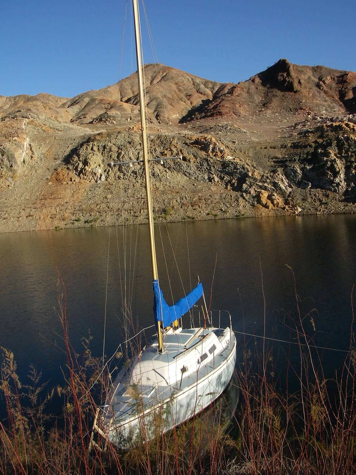 Even though we had passed Anchoring 101 in Hawaii, Andrew still felt a little nervous about the idea of anchoring Windchime overnight in Lake Mead. Lake Mead is extremely deep and nothing but rock, where would you anchor? After every sail race, our fellow sailors would encourage us saying Lake Mead is fantastic for anchoring, easy as pie. All you have to do is drive your sailboat up on a steeply sloping beach and throw the anchor against a rock on shore. We were promised beautiful sunsets, starry nights, and a campfire on shore.