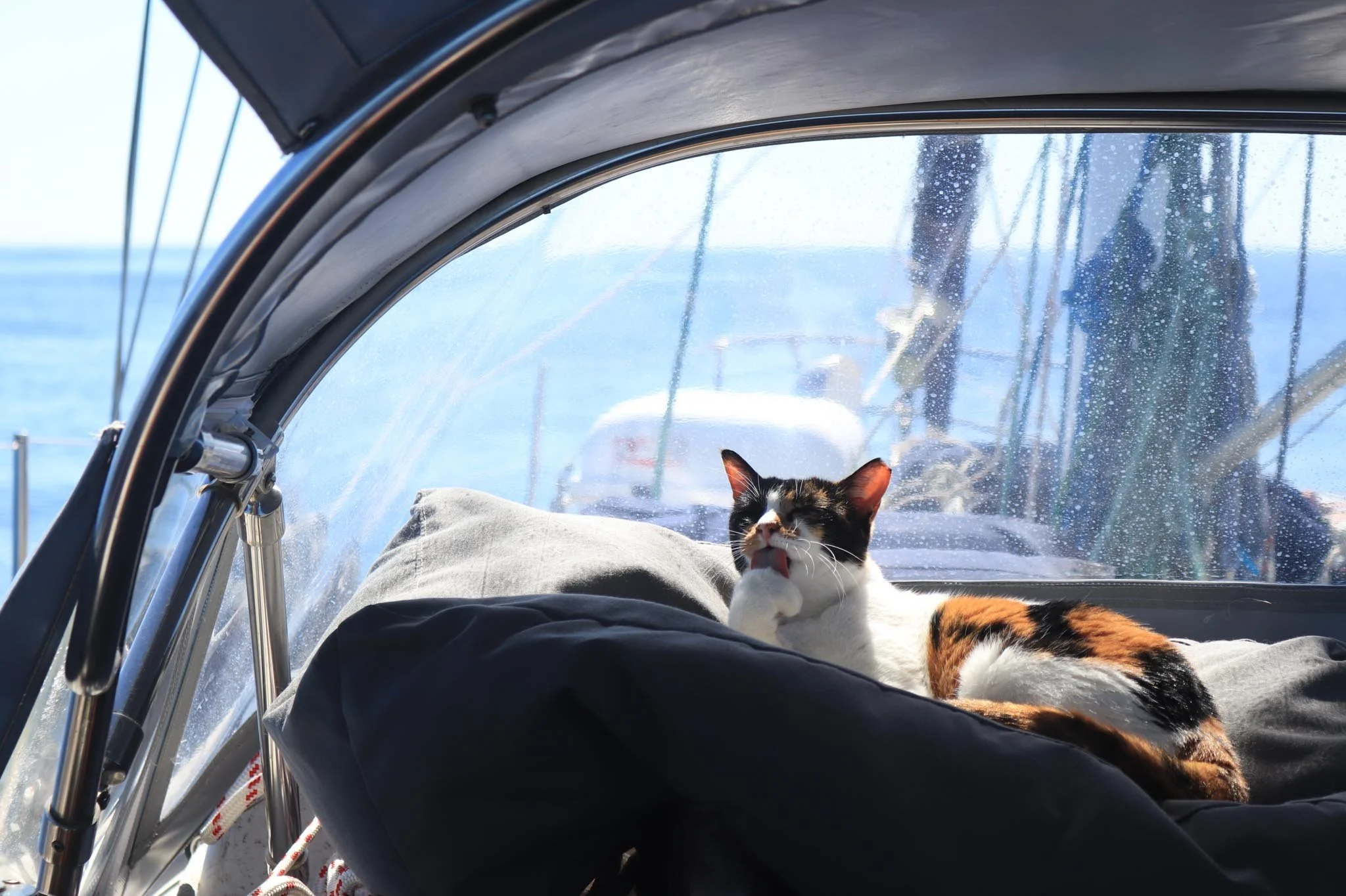 She looked overboard to port, then stalked to the other side of the cockpit and looked overboard starboard. She sulked back on her haunches, then climbed over my legs to tuck into her sailing shelf just inside the door.